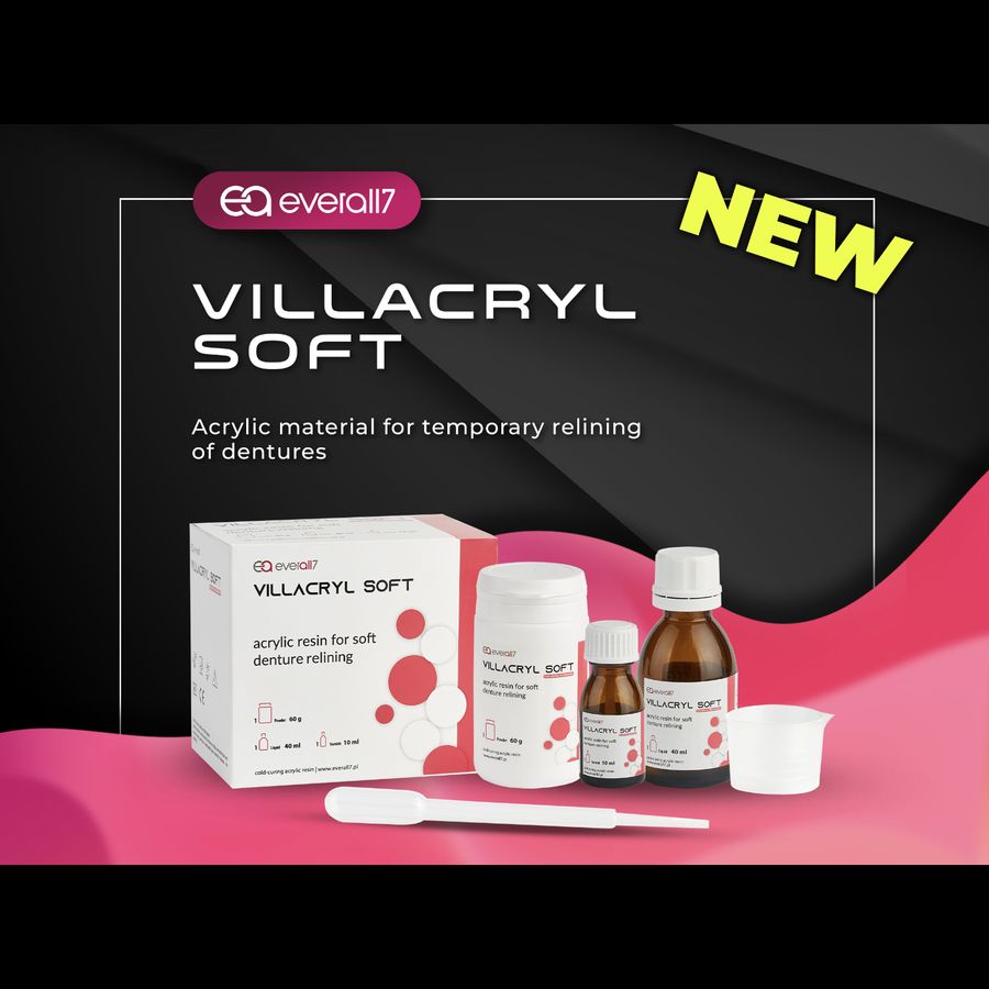 Hidegen polimerizálódó akril anyag műfogsorok ideiglenes puhán maradó alábélelésére. A Villacryl Soft új formulája nem tartalmaz veszélyes ftalátokat, minősített intézetek és egészségügyi hatóságok tesztelték. A paraméterek és a funkcionális tulajdonságok stabilitása 30 napos használat mellett garantált a páciens szájában.