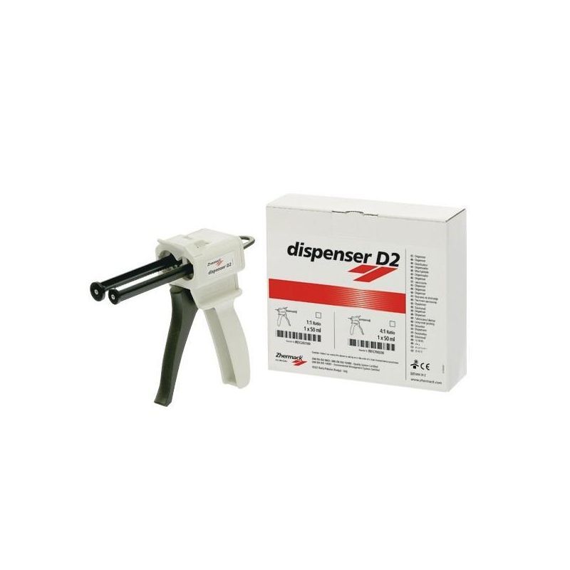 Zhermack lenyomatpisztoly 1:1, 1:4 arányú A-szilikon lenyomatanyagok keverésésre, illetve Gingifast Rigid és Elastic anyagok használatához.