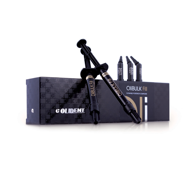 OliBULK Fill fényre keményedő kompozit anyag direkt tömésekhez: tejfogakhoz és a maradandó őrlőfogakhoz, 4 mm vastagságban megvilágítható technikával. Az elasztikusság és folyékonyság optimális arányának köszönhetően gyorsan és kényelmesen alkalmazható, valamint formázható.