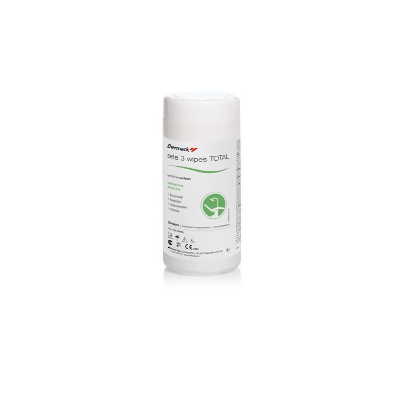 Zhermack ZETA 3 WIPES TOTAL fertőtlenítőkendő, aldehidmentes, széles hatású. Orvosi eszközök, kézidarabok, fogászati egységek, könyökdarabok, stb. fertőtlenítésére. Dobozos kiszerelésben.